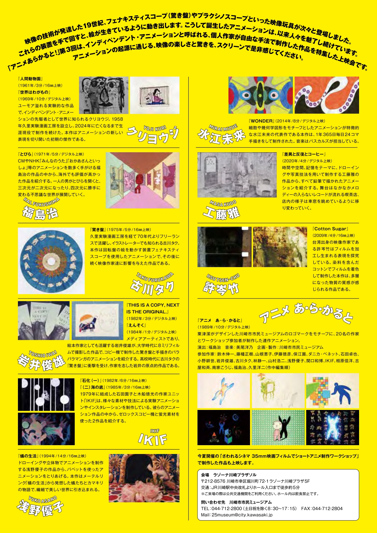 映像の技術が発達した19世紀、フェナキスティスコープ(驚き盤)やプラクシノスコープといった映像玩具が次々と登場しました。 これらの装置を手で回すと、絵が生きているように動き出します。 こうして誕生したアニメーションは、以来人々を魅了し続けています。 「アニメあらかると!」第3回は、インディペンデント・アニメーションと呼ばれる、個人作家が自由な手法で制作した作品を特集した上映会です。 アニメーションの起源に通じる、映像の楽しさと驚きを、スクリーンで是非感じてください。