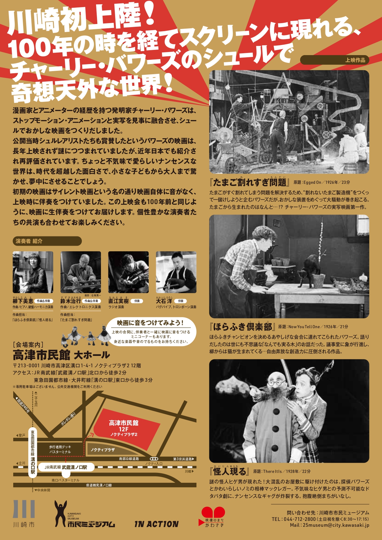 川崎市市民ミュージアム主催。 ピアノやバグパイプ等の演奏と併せて時代を超えた「笑撃(しょうげき)」をお楽しみください。